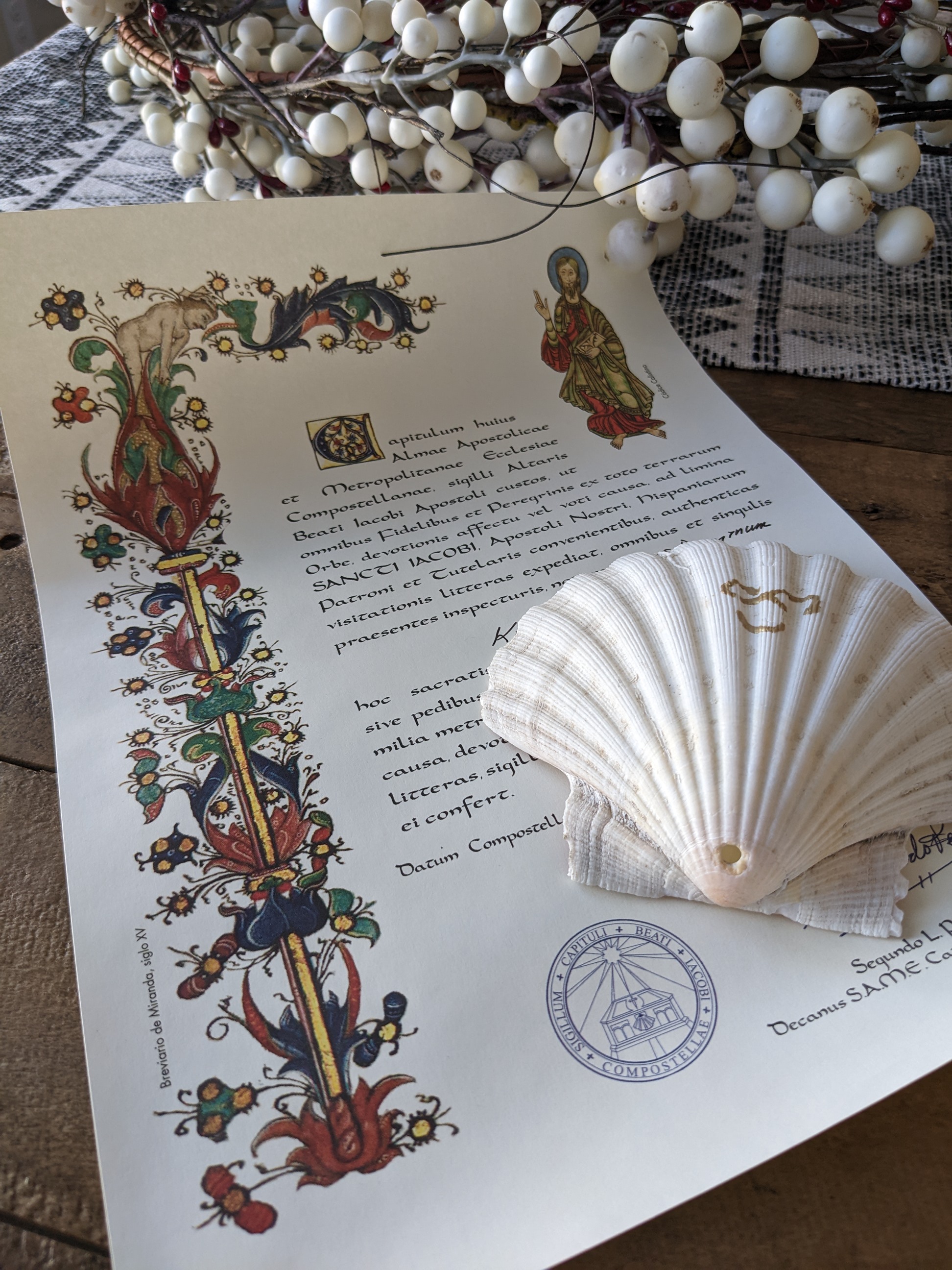 The above photos show the credencial (passport) with stamps along the way, the Compostela (certificate) and a scallop shell we carried on our bikes, which has become an iconic symbol of the Camino.