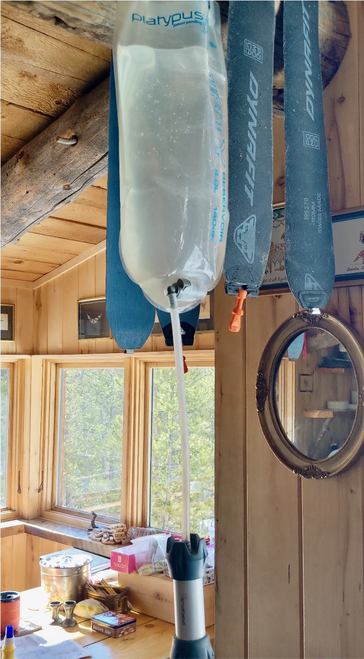 Water is obtained from snowmelt in the winter and nearby streams in the summer. In the winter, hut users must be prepared to shovel snow outside the hut, melt it in a large pot on top of the wood burning stove, and then filter the water before consumption. My favorite method for filtering water with a large group is to use the Platypus GravityWorks Water Filter, and I will pre-filter the water using a cloth around the spout on the pot.