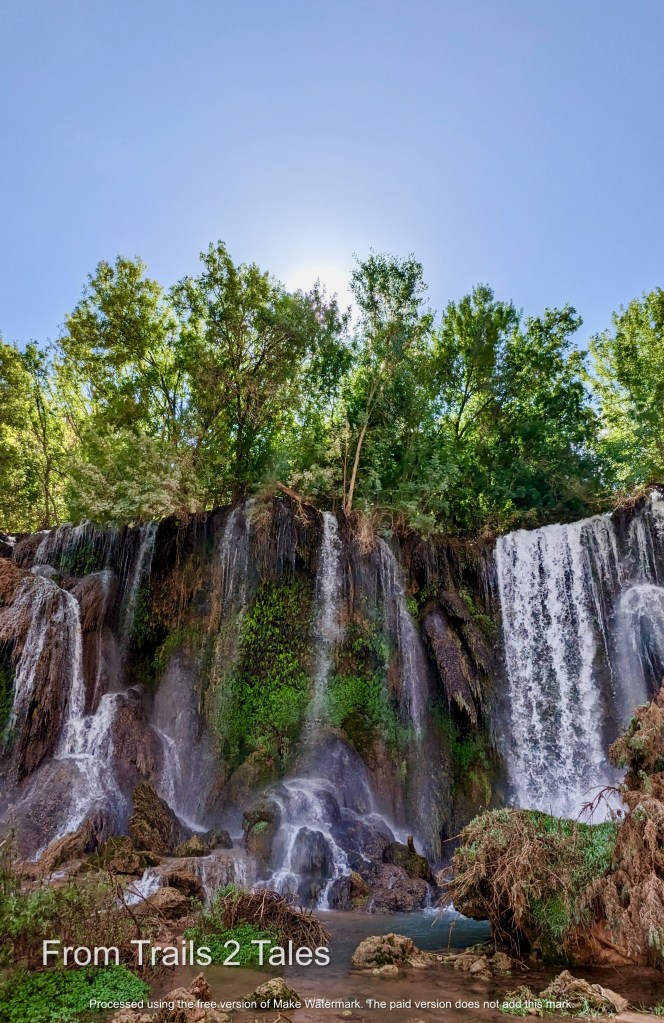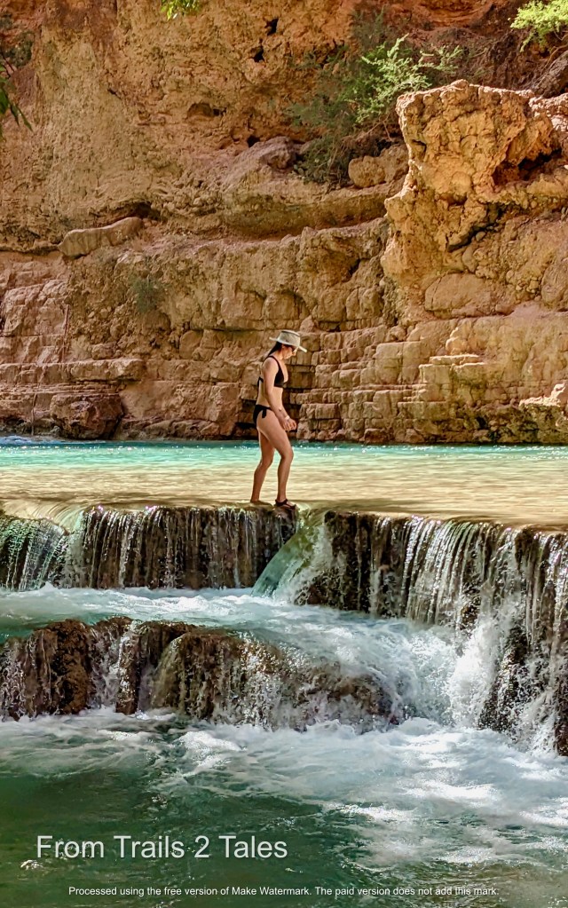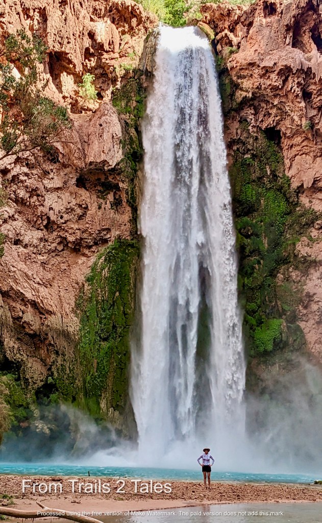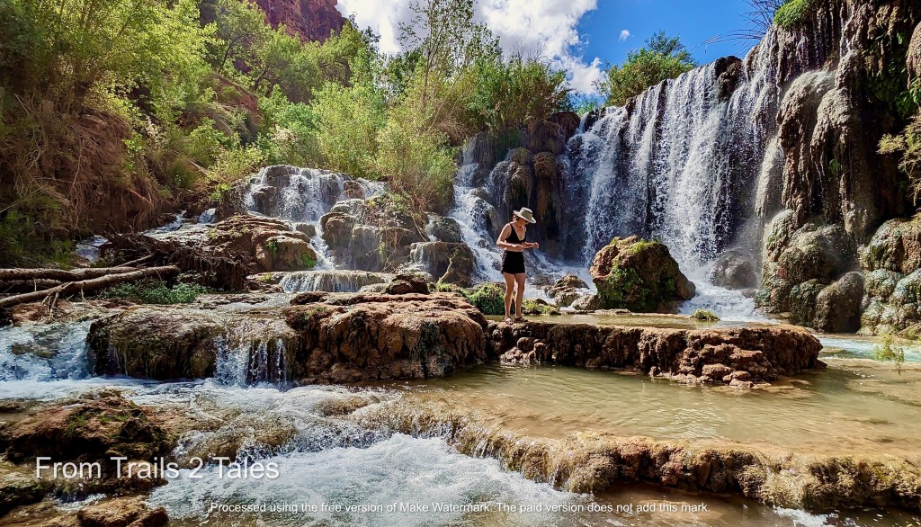 Fifty Foot Falls are the first set of waterfalls you will pass on your way out of Supai village. However, they are mostly obscured from the trail and getting to them is not straight-forward. I found them by following a trail near the first set of pit toilets that you pass beyond Supai. You will have to duck under thick bushes and wade through thigh-high water to reach them. Because of this, fewer people make the trek to see Fifty Foot Falls.