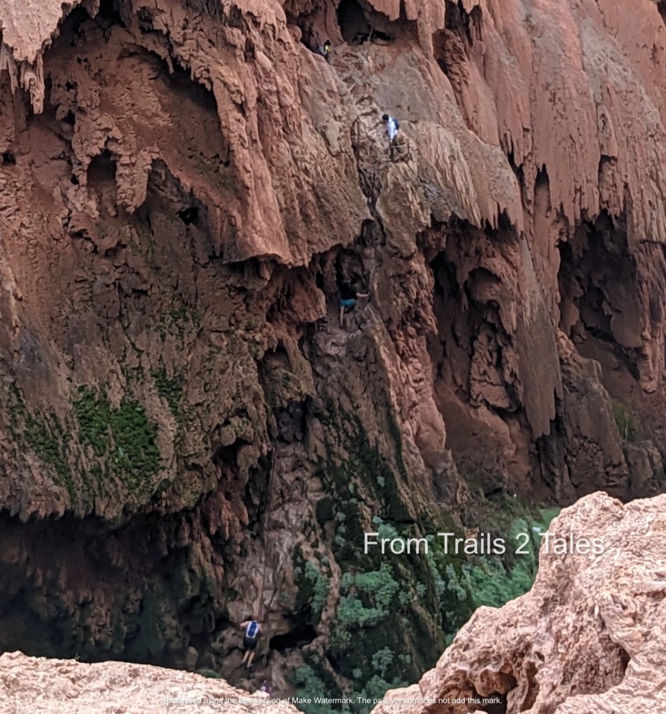 Probably the most exhilarating part of Mooney Falls is the trip you must take in order to view the falls from the bottom and also to continue on to Beaver Falls. This descent is not for the faint of heart. I am fairly used to exposure while hiking and this got my heart racing. To reach the bottom, you will have to descend 200 feet first through a short cave, and then down ‘steps’ worn into the rock with thick metal chains to hold on to. This section is highly exposed and would be quite dangerous without the metal cables. There might even be a pile of gloves that people use and leave at the top and/or bottom when they are finished. Close to the bottom, you will climb down several ladders. The whole time you are being sprayed by mist from the waterfall, which also makes the steps and cables wet and slippery. As long as you go slowly and always maintain three points of contact, this is doable. I saw individuals of all ages and fitness make the descent. And, it is absolutely worth it.